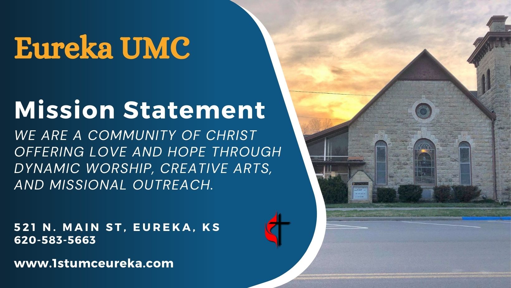 Come and worship with us and engage in our vital activities. The United Methodist Church of Eureka is located on North Main and strives to be a vital part of the Eureka community. We are a community of Christ offering love and hope through dynamic worship, creative arts and missional outreach. In addition to Sunday worship at 9:30 am, we have an active United Women in Faith group, United Methodist Men’s group, Kid's Club, Choir, and Grief Support Group.